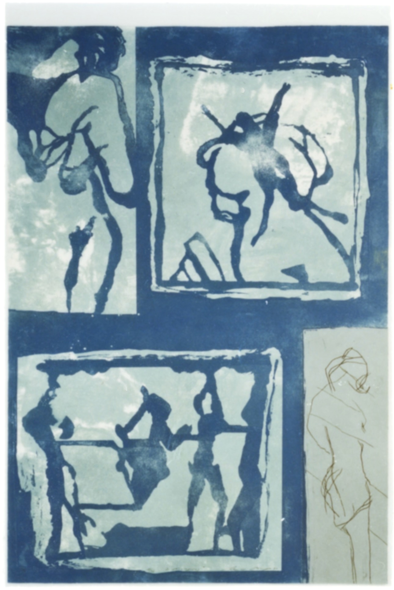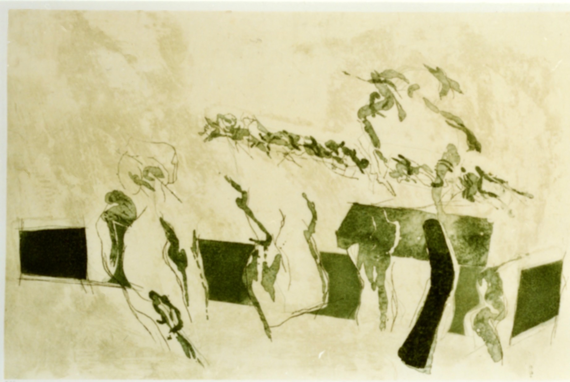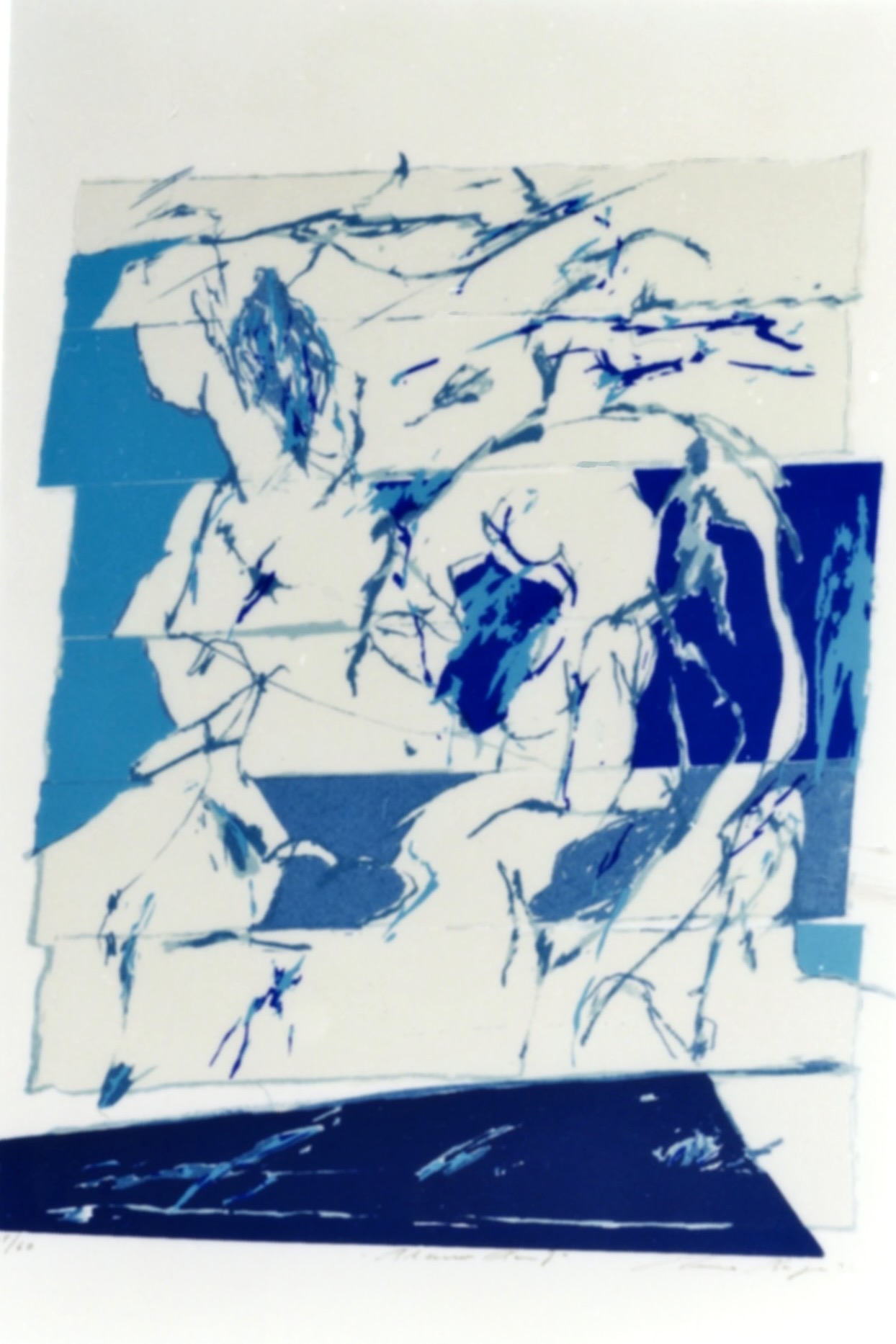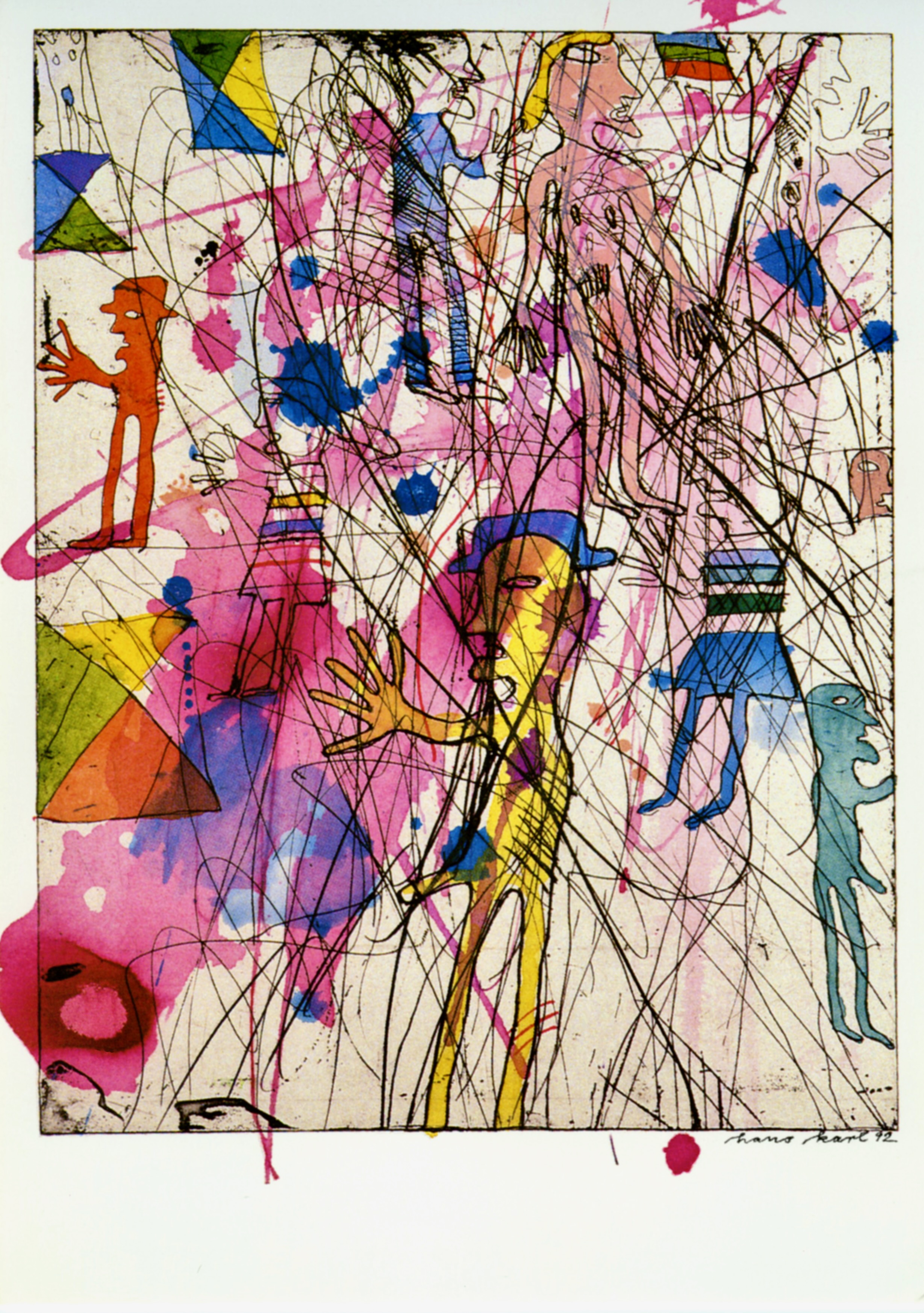 1 | In Bewegung, 1991, Farbradierung mit Collage, sign., dat., num. und bet., 93,5 x 63,5 auf span. Bütten, DM 610,-