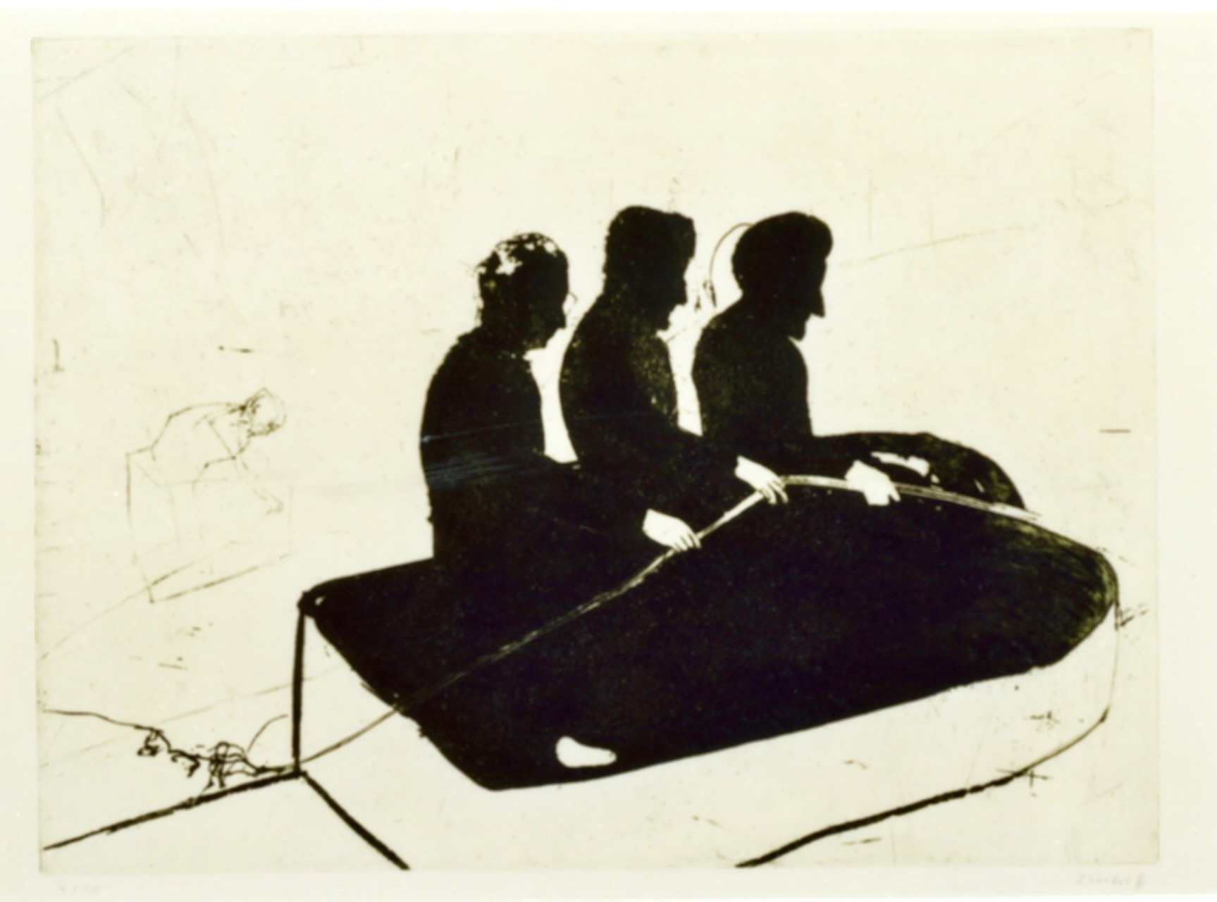 14 | Damen und Herren auf bewegter Fläche, 1993 Radierung, handkoloriert, jedes Blatt hat Unikatcharakter, sign. und datiert, 30 x 22 cm auf 57 x 40 cm, Bütten. Vom Künstler in Passepartout (80 x 59,5 cm) montiert Fünf Exemplare für den Förderverein, DM 595,-