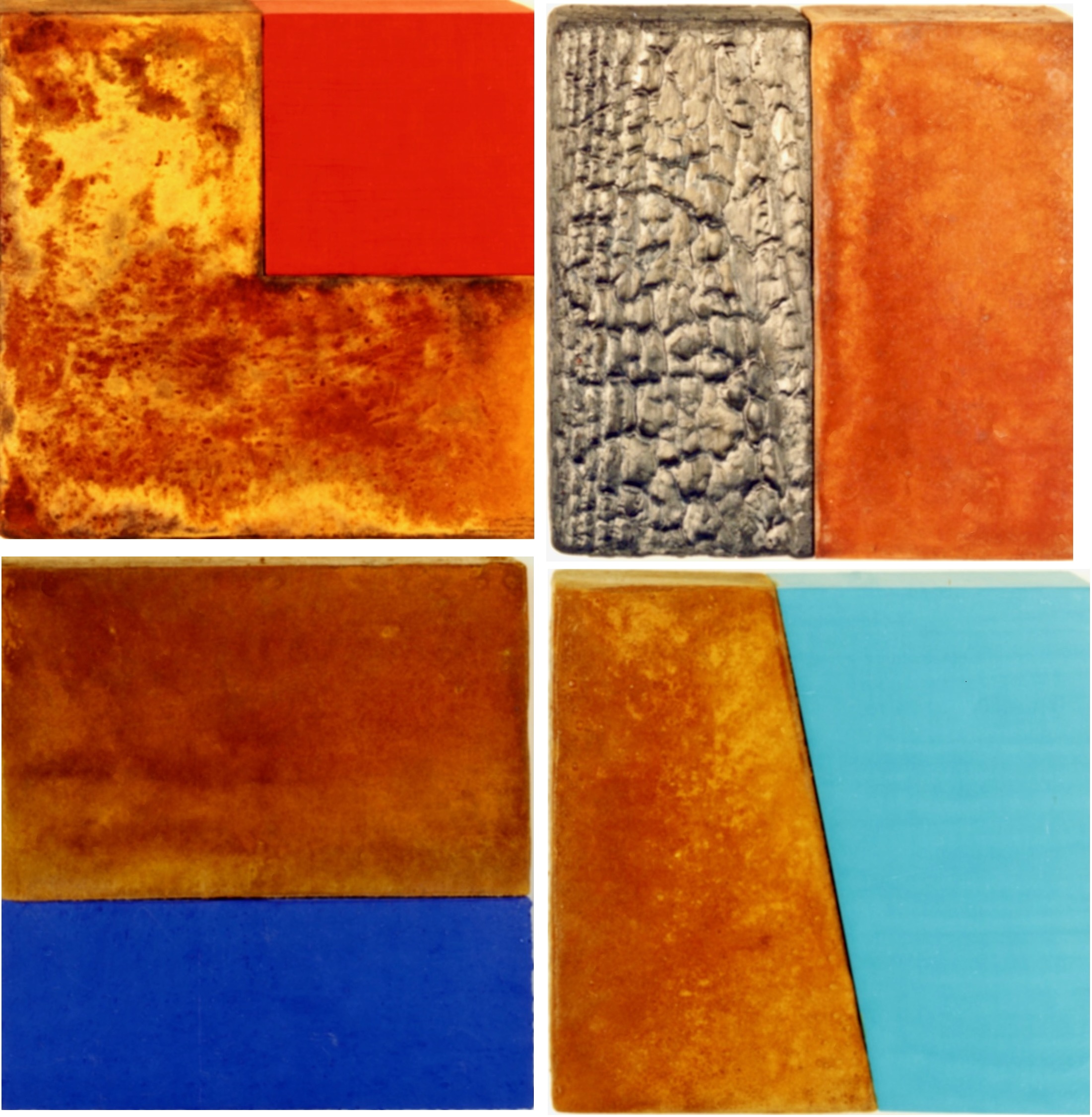 6a - Rost und Rot, Eisen und Acryl auf Holz | 6b - Schwarz und Rost, Gebranntes Holz und Eisen auf Holz | 6c - Rost und Ultramarinblau, Eisen und Farbpigmente auf Holz | 6d - Rost und Türkis, Eisen und Pigmente auf Holz, Sign., dat. und num. Je zehn Exemplare für den Förderverein, Einzelpreis je DM 560,-, als Set je DM 480,-