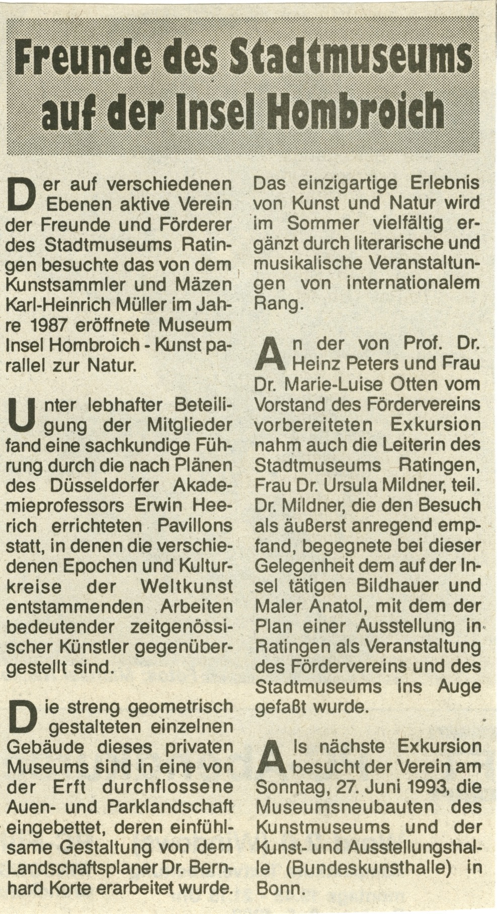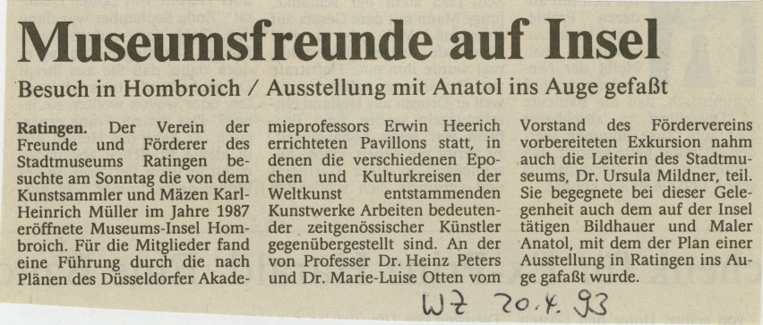 Die streng geometrisch gestalteten einzelnen Gebäude dieses privaten Museums sind in eine von der Erft durchflossene Auen- und Parklandschaft eingebettet, deren einfühlsame Gestaltung von dem Landschaftsplaner Dr. Bernhard Korte erarbeitet wurde. Das einzigartige Erlebnis von Kunst und Natur wird im Sommer vielfältig ergänzt durch literarische und musikalische Veranstaltungen von internationalem Rang. An der von Prof. Dr Heinz Peters und Frau Dr. Marie-Luise Otten vom Vorstand des Fördervereins vorbereiteten Exkursion nahm auch die Leiterin des Stadtmuseums Ratingen, Frau Dr. Ursula Mildner, teil. Dr Mildner, die den Besuch als äuBerst anregend empfand, begegnete bei dieser Gelegenheit dem auf der Insel tätigen Bildhauer und Maler Anatol, mit dem der Plan einer Ausstellung in Ratingen als Veranstaltung des Fördervereins und des Stadtmuseums ins Auge gefaßt wurde. Als nächste Exkursion besucht der Verein am Sonntag, dem 27. Juni 1993 die Museumsneubauten des Kunstmuseums und der Kunst- und Ausstellungshalle (Bundeskunsthalle) in Bonn. Am Mittwoch, den 2. Juni 1993 um 18:30 Uhr findet im Stadtmuseum Ratingen am Peter-Brüning-Platz, Eingang Grabenstraße 21, die nächste Mitgliederversammlung statt, zu der auch Gäste willkommen sind. Bei dieser Gelegenheit wird Frau Dr. Mildner über Neuerwerbungen des Stadtmuseums berichten. Mit freundlichen Grüßen und Dank | |
